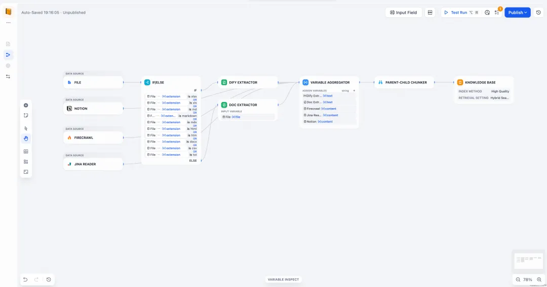 继承 Dify Workflow 画布体验,将 RAG 的 ETL 过程拆分为独立节点(数据源接入、文档解析、分块策略等);
